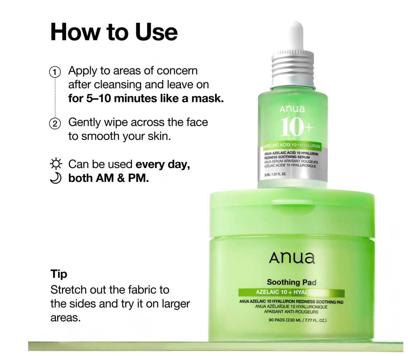After cleansing, apply the pad to areas of concern and leave it on for 10–20 minutes like a mask. Then gently wipe across the face to smooth and refresh your skin. Suitable for daily use, both morning and night.