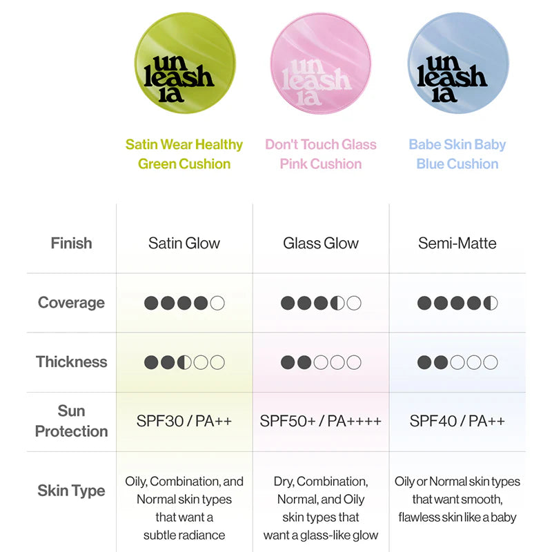 Unleashia Healthy Green Cushion offers lightweight yet flawless coverage with added skincare benefits for a healthy, radiant glow. This vegan cushion foundation is infused with bakuchiol, 76% water essence, and papaya fruit extract to keep your skin nourished and balanced, while delivering a natural semi-matte satin finish. With SPF30 PA++, it provides reliable sun protection and is packed with soothing, skin-loving ingredients like parsley extract. The long-lasting formula maintains hydration and a fresh, natural look throughout the day.