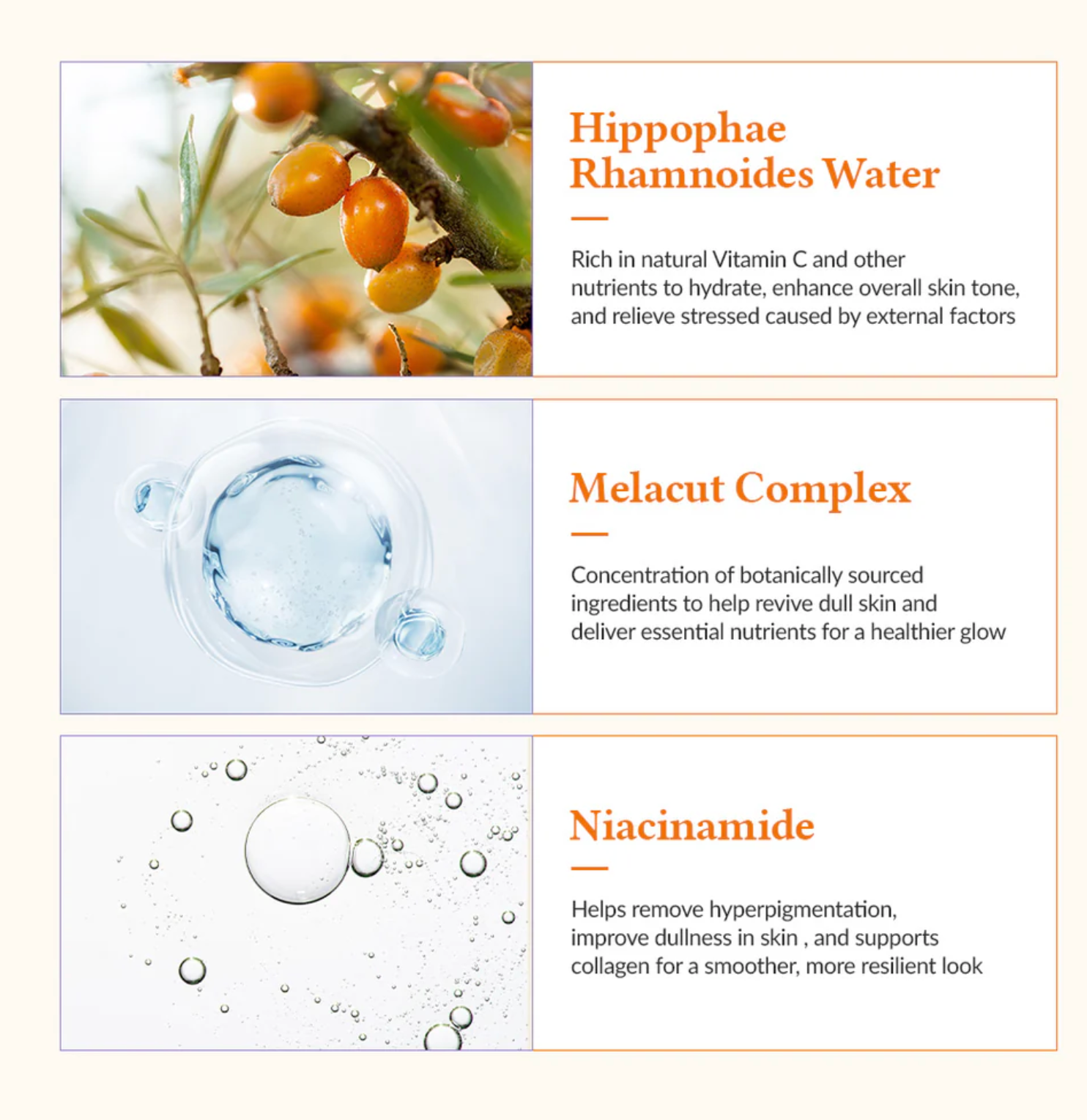 Water, Glycerin, Hippophae Rhamnoides Water, Niacinamide, Butylene Glycol, 1,2-Hexanediol, Methyl Gluceth-20, Polyglyceryl-10 Laurate, Arginine, Carbomer, Allantoin, Ethylhexylglycerin, Adenosine, Melia Azadirachta Flower Extract, Ocimum Sanctum Leaf Extract, Disodium Edta, Melia Azadirachta Leaf Extract, Curcuma Longa (Turmeric) Root Extract, Corallina Officinalis Extract, Portulaca Oleracea Extract, Vitis Vinifera (Grape) Seed Extract, Saururus Chinensis Extract, Rice Ferment Filtrate (Sake)